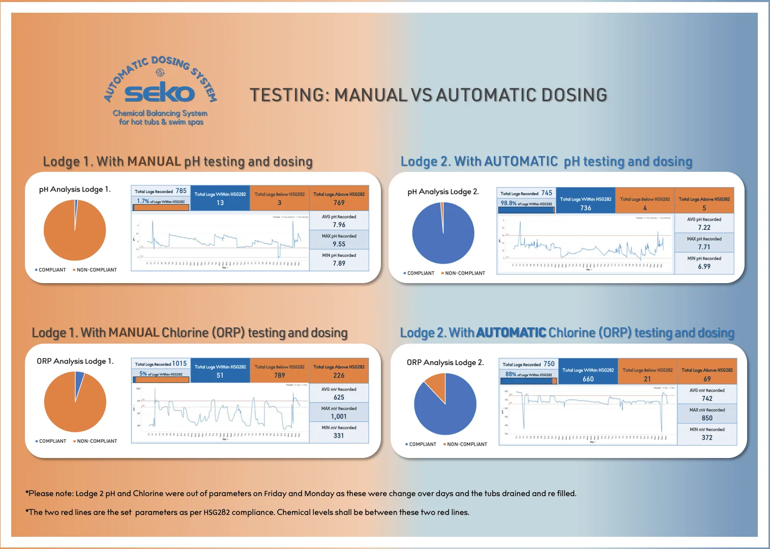 Trials showed manual pH dosing was non-compliant 654 of 658 times, causing nearly 95% chlorine non-compliance. Auto dosing ensures accuracy, reduces waste, and lowers costs.