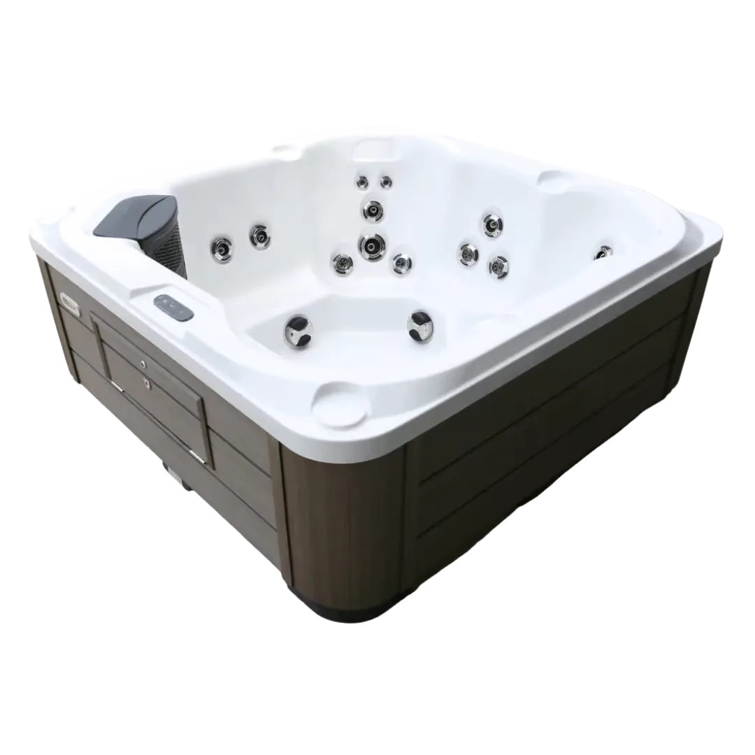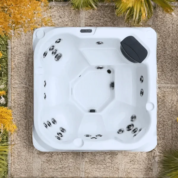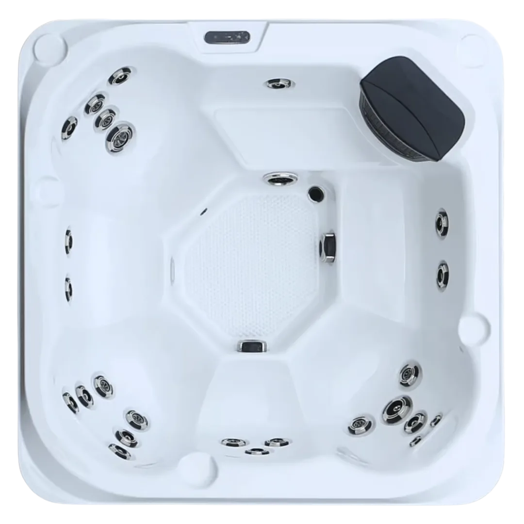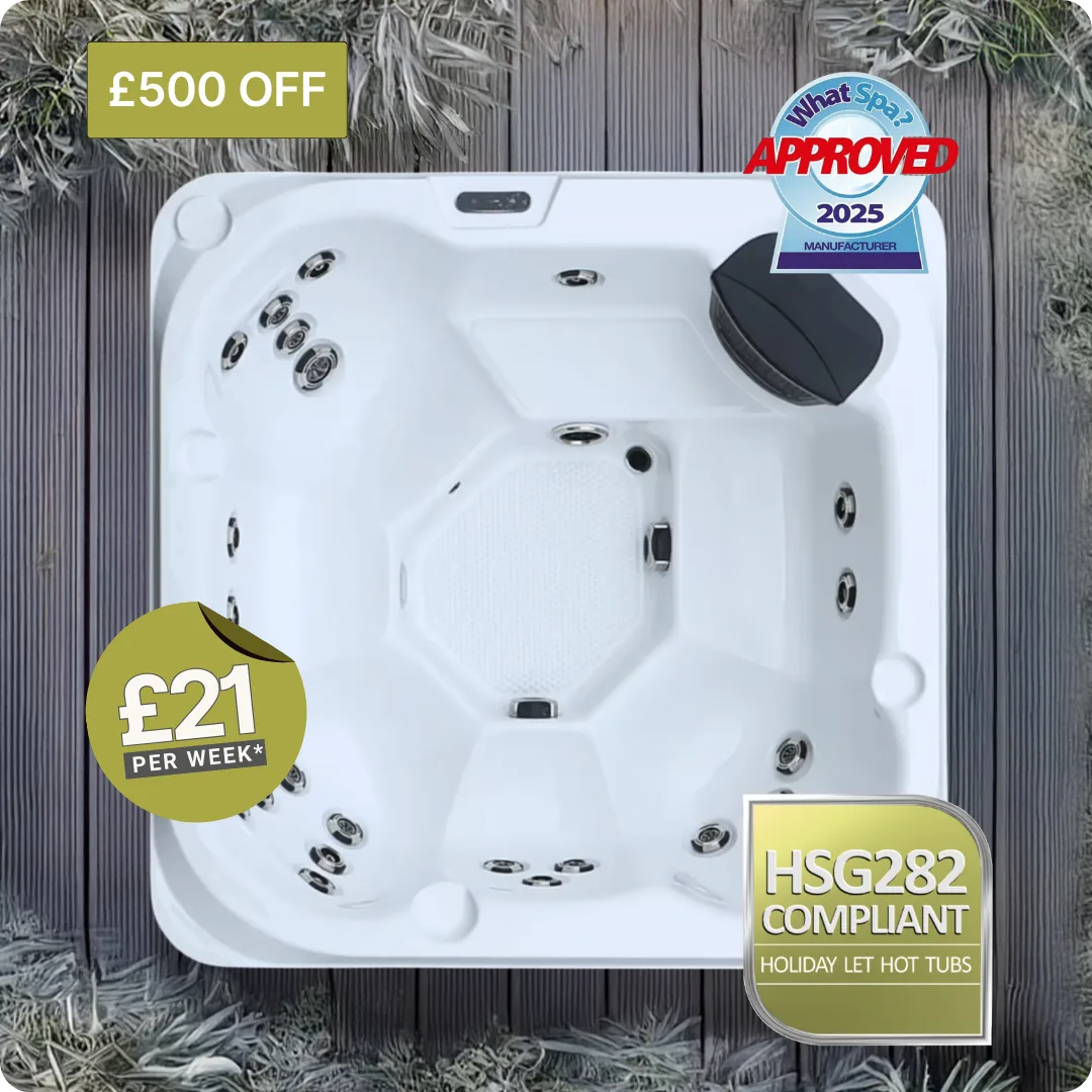The Fiesta, designed in the UK for holiday parks, features 25 strategically positioned jets — 1 Extra Large, 1 Large, 21 Medium, and 2 Small — delivering a perfectly balanced hydrotherapy experience with powerful jets for deep muscle relief and smaller jets for soothing relaxation.